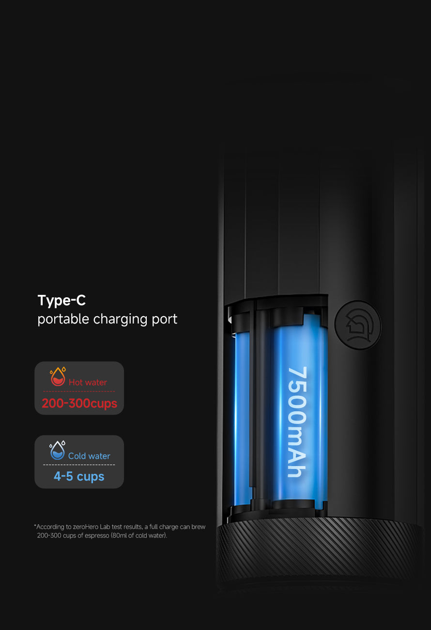 Ultra-light 710g design with a 7500mAh battery, supporting 200–300 hot brews per charge. Ideal for travel, office, and daily carry.