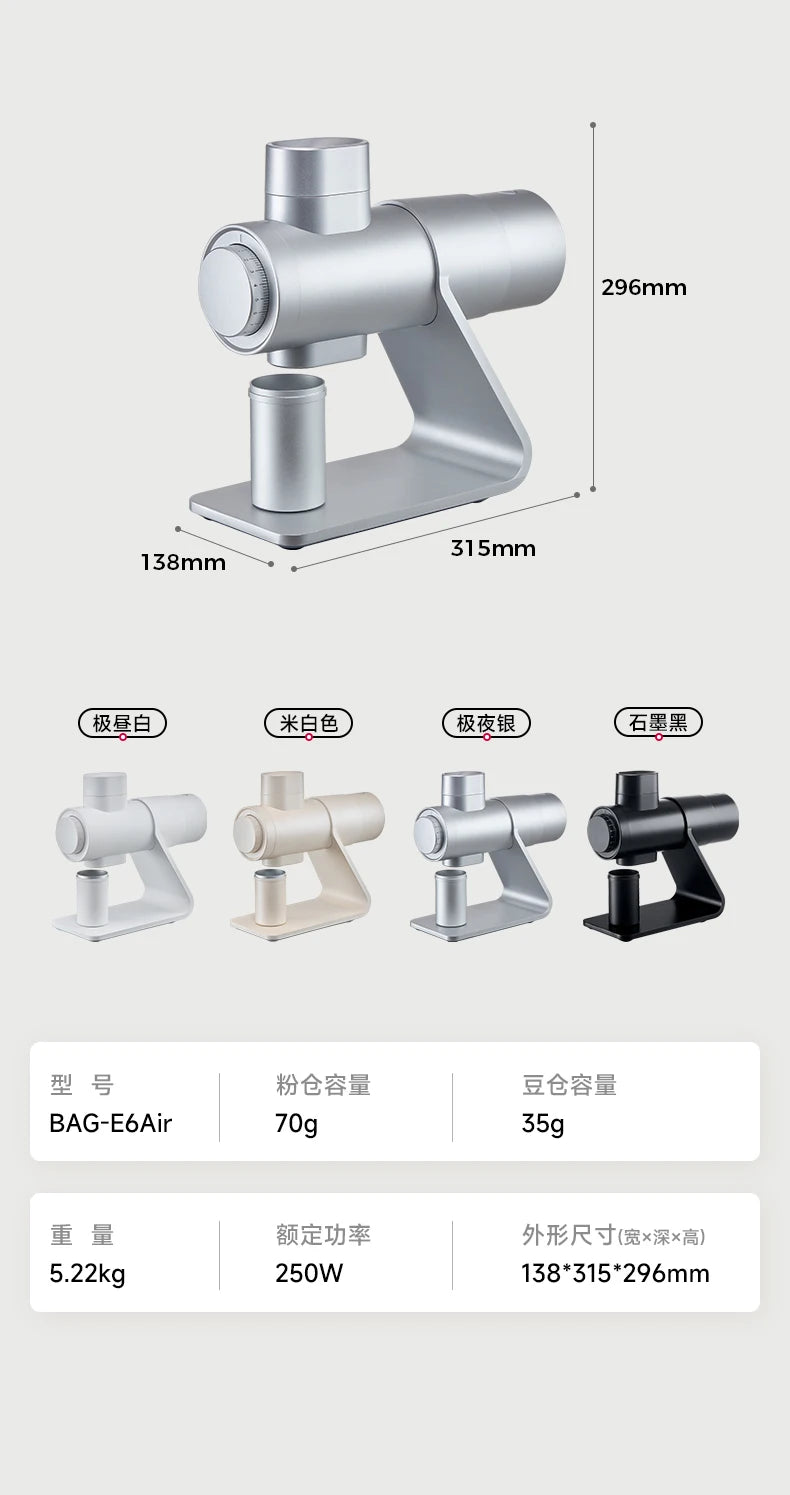 The High-Efficiency Coffee Grinder delivers fast, consistent grinding for home baristas who want café-quality results. Powered by a 250W motor, it features a 64mm flat burr set that produces uniform grounds for espresso, pour-over, and filter coffee. Its adjustable settings allow you to dial in the perfect grind, while the compact design fits easily on any countertop. Built with durability and precision in mind, the E6Air makes your daily coffee routine smoother and more enjoyable.